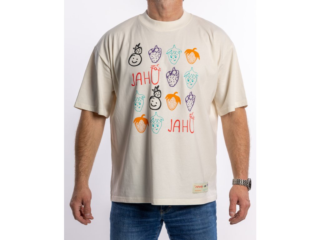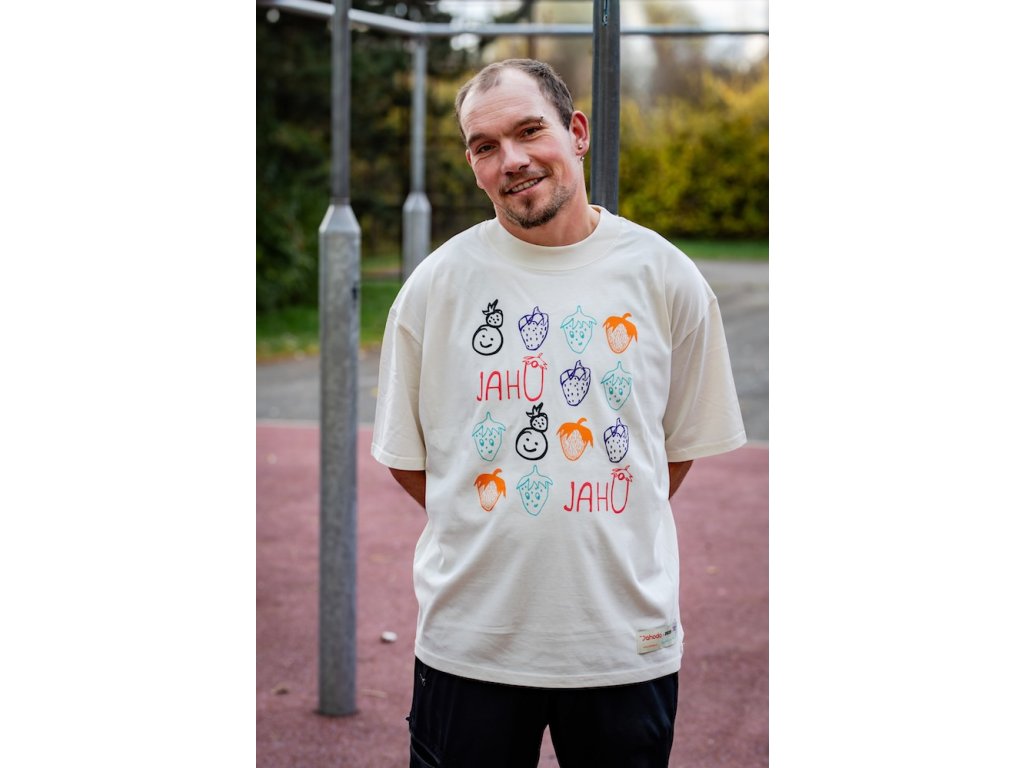 Někdy je složité to všechno poskládat tak, aby to mělo tu správnou šťávu… ale stojí za to zkusit! Tričko vzniklo ve spolupráci návrhářky Terezy Rosalie Kladošové a dětí z Černého Mostu, kde Jahoda působí.